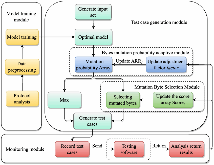 变异策略是影响模糊测试效率与效果的关键因素。为提高模糊测试性能,MTA Fuzzer提出了一种新的模糊测试框架(图2)。在测试用例生成阶段,MTA Fuzzer引入了字节变异概率自适应策略以取代Transformer的贪心策略。该策略能够根据测试反馈动态调整新生成测试用例中各字节的变异概率,从而在提高系统异常触发率的同时,有效降低测试用例的重复率。此外,MTA Fuzzer进一步采用了变异字节自适应选择机制,以在实现变异过程自适应优化的同时,保持变异结果的多样性。实验结果表明,相较于其他的方法,MTA Fuzzer不仅提高了模糊测试的效率和自适应能力,还有效的降低了测试用例的重复率。
