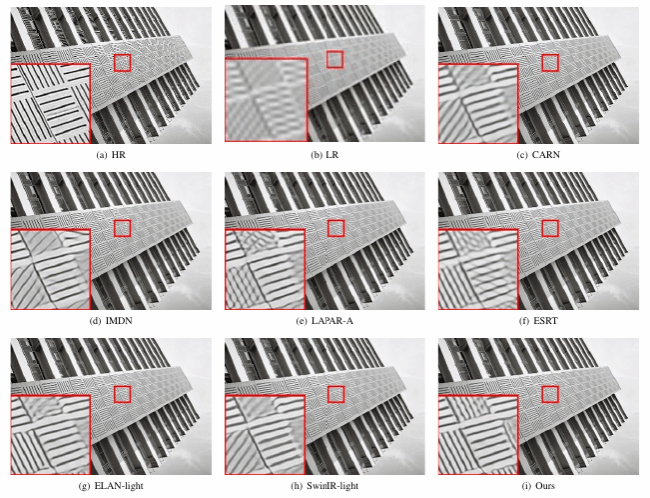 实验结果表明,提出网络在众多超分辨图像重建方法中取得了先进性能。如图4所示,本文提出方法在低分辨率图像的细节恢复能力超过所有对比方法。从图4放大区域可观察到,低分辨图像的纹理已被破坏,而比对方法中,只有ELAN-light(ECCV 2022)和本文提出方法能正确地重建放大区域的纹理,并且产生的伪影较少。