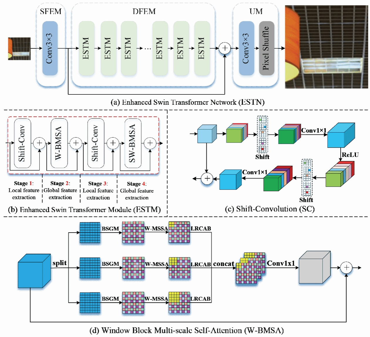 尽管各类图像重建方法层出不穷,但开发能高质量重建图像纹理细节且不产生失真伪影的神经网络仍面临挑战。有鉴于此,该工作在Swin Transformer网络框架中引入移位卷积算子(如图1(c)所示)以提取局部细节并增强空间与通道信息交互,同时设计一种新颖的窗口多尺度自注意力机制(如图1(d)所示)以增强网络的全局感受野和多尺度特征感知能力,并将两种结构堆叠为具有交替串联结构(如图1(a)-(b)所示)的特征融合结构。此外,本文还设计了一个低参数的残差通道注意力块(Low-parametric Residual Channel Attention Block,LRCAB)进一步去除通道冗余信息(如图1(d)和图3所示)。