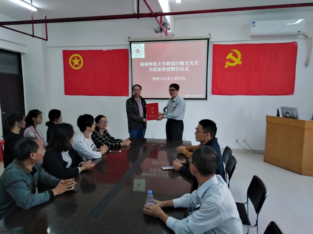物信学院于2017年10月31日下午在科技楼北907举行客座教授聘任仪式。聘任仪式由院党委书记张跃聪主持,副院长白炳良、院长助理陈添丁及师生代表参加了聘任仪式。物信学院聘任厦门大学博导闫敬文教授为客座教授,闫教授就研究生联合培养,学科建设等众多领域与学院领导、专任教师以及研究生展开热烈讨论。闫教授表示,将大力支持mx动漫
