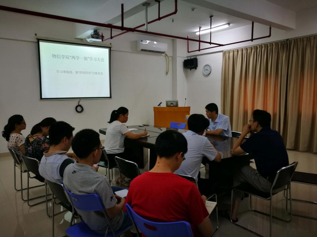 下午,物信学院五个教工党支部在科技信息楼9楼开展“两学一做”学习教育常态化制度化第一专题“学习贯彻习近平总书记重要指示精神、深入向廖俊波同志学习”活动。学院班子成员、党委委员以普通党员身份全程参加学习讨论,并与支部党员一起谈感想、讲体会。
