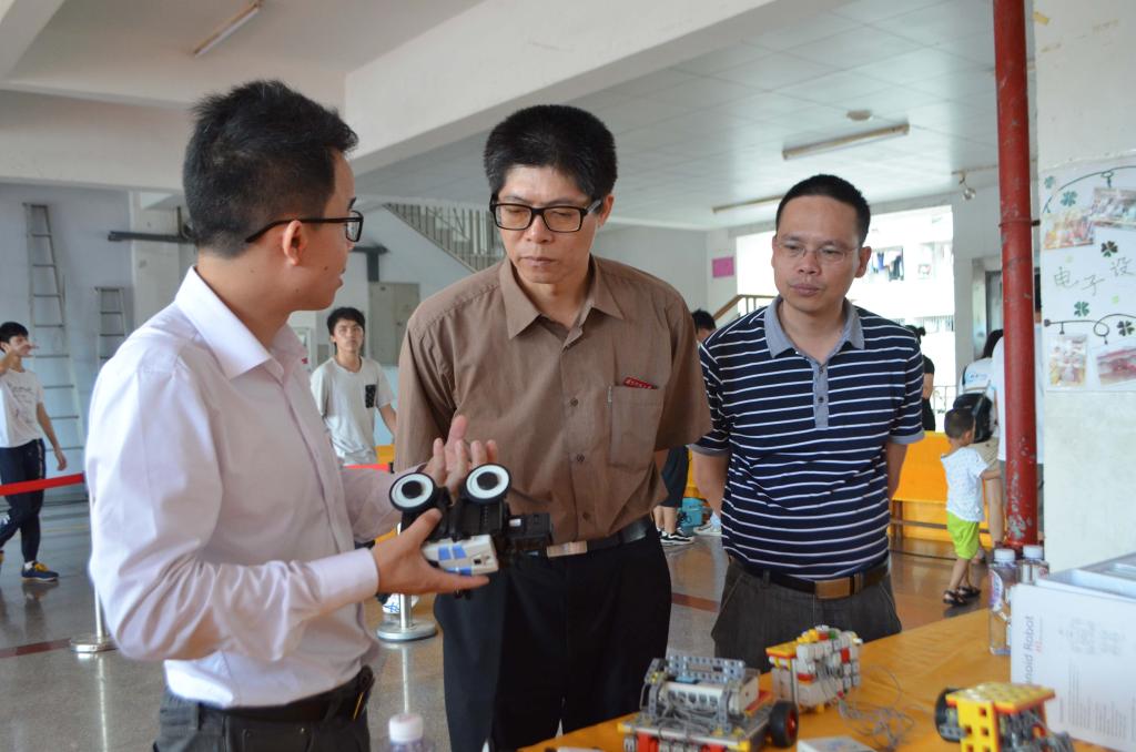 党委书记张跃聪宣布游园活动正式开始。游园活动设置有七个活动区:一是电子作品展区,其中包括了校电子设计大赛,合泰杯,创客空间等优秀作品,二是创意作品展区,三是机器人展区,在这里你可以看见龙文区科普馆和厦门羽星科技有限公司提供展出的机器人,四是漳州市科技馆互动仪器展区,五是两学一做知识展区,阅读党员好书,学习党的知识,六是义务维修区,包括家电维修和电脑维修,竭诚为您服务,七是趣味游戏互动区。每一个活动区域都有很多学生驻足停留,沉浸在良好的活动氛围中。其中,电子展区和创意作品展区的优秀作品引发了不绝的称赞。“智能冲奶机”在奶粉冲泡上既细致又人性化的设计让观众眼前一亮;本届mx动漫