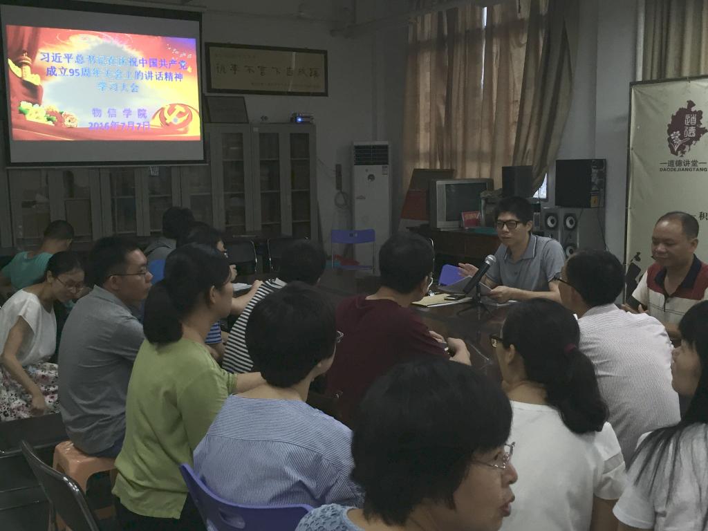 7月7日下午,物信学院党委理论学习中心组举行扩大会议,组织学习习近平总书记在庆祝建党95周年纪念大会上的讲话和省委尤权书记在福建省庆祝中国共产党成立95周年大会上的讲话精神。学院领导班子成员、党委委员、科级以上干部、教研室主任、教工支部委员、教师党员代表参加会议。