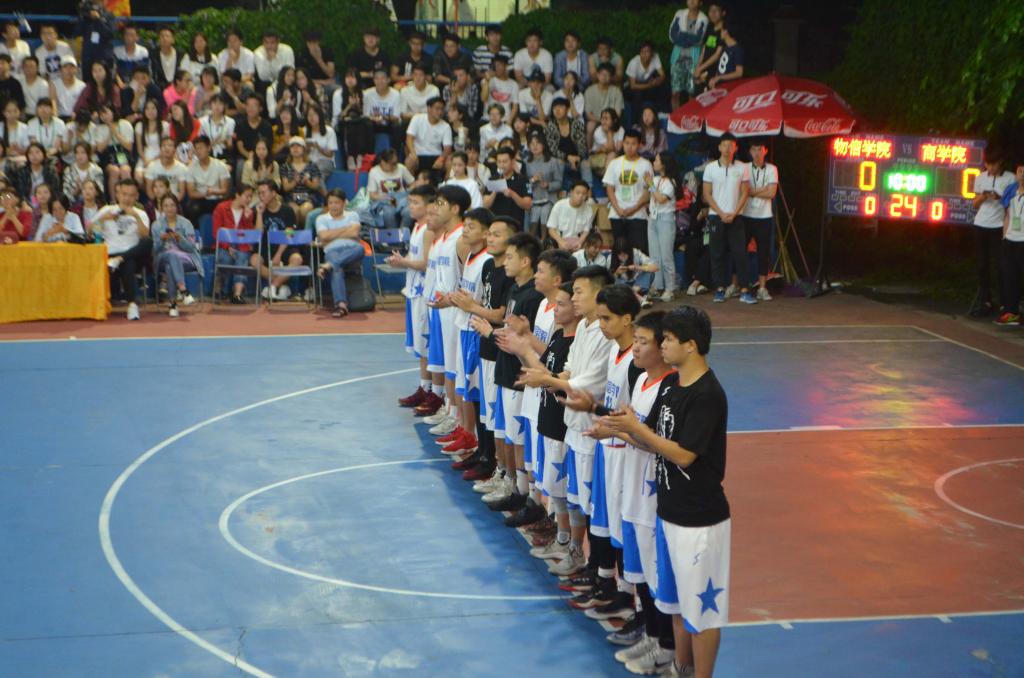在短暂的中场休息后第三节物信学院更是势如破竹,全队配合默契,渐渐拉大与商学院的比分,商学院也奋起直追,精彩镜头不断切换,双方精彩的三分球更是让大家尖叫不断。篮球击地有力的声音、厚重的鼓声、观众的掌声交相辉映,成为了队员们奋起进攻的动力,第三节物信学院仍占上风。随后第四节在紧张的气氛中开始了,商学院铆足了劲,三分球后又投入了一个球,现场开始沸腾,比分渐渐拉近,物信学院也高度集中精力,从容不迫。在剩下不多的时间,物信学院领先一分。比赛进入白热化,场上只剩8秒钟,球回到商学院手中,在观众的倒计时声中,商学院投出了最后一个球,球与球框擦肩而过。哨声吹起,比赛结束,比分定格在75:76,物信学院勇夺冠军,全场欢呼声、尖叫声、呐喊声不断,大家为这一刻的胜利发出最骄傲的呐喊与欢呼。