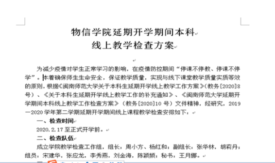 一是上下齐心,督导到位。自2月17日线上授课以来,学院领导高度重视线上课程建设及教学质量监督把控,制定了《物信学院延期开学期间本科线上教学工作检查方案》,成立学院教学检查工作组,实时跟踪线上教学的进展,做到教学、检查督导环节全覆盖,建立线上巡查机制。教学检查工作组通过平台查看教师的授课情况、各类资料及学生完成的情况,保证线上授课教学质量。抽查范围不小于学院线上开课老师的20%,从中总结梳理在线课堂中存在的问题,并且每周形成一份检查报告,完善线上教学监控。