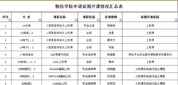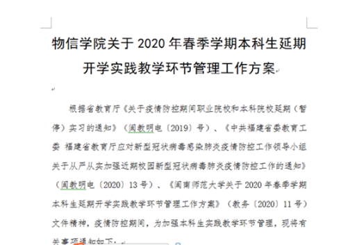 面对疫情导致的延期开学,学院及时制定《物信学院关于2019-2020学年第二学期本科生延期开学线上教学工作方案》,启动延迟开学期间线上教学各项准备工作,布置教学任务和安排,及时收集《物信学院2019-2020第二学期在线课程开课具体信息汇总表》《物信学院2019-2020第二学期申请延期开课情况汇总表》等表格,掌握线上教学开课情况、了解开课平台等信息。学院通过超星学习通、爱课程、智慧树、腾讯课堂等在线课程平台,结合录屏、直播等手段进行线上学习。及时组织师生进行前期平台操作使用培训,并鼓励教师进行线上教学模式交流分享。同时,组织教师建立了覆盖全体听课学生的课程微信群、QQ群,为学生提供在线学习支持。对于少数教师因疫情管控、网络条件等原因无法开设线上课程,教务科及时向教务处备案延期开课,并稳妥做好后续工作。对于实践课程的延期开课,制定了《物信学院关于2020年春季学期本科生延期开学实践教学环节管理工作方案》,以确保学生返校后实践课程能快速及时开展。