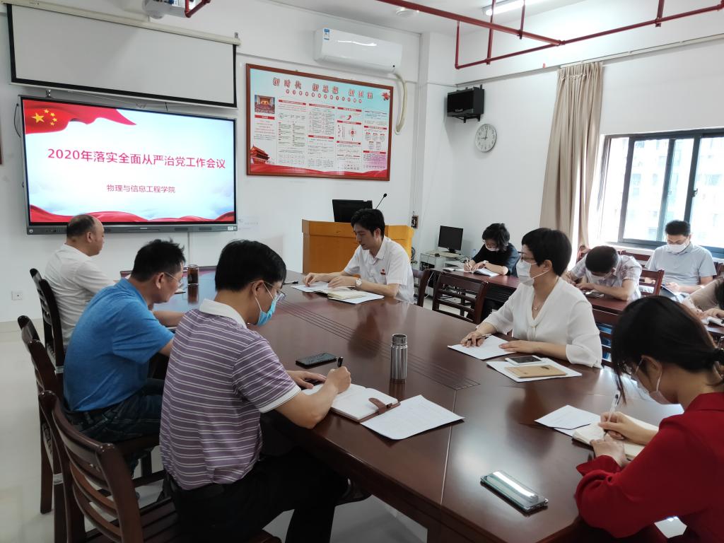在科技楼北907召开物信学院落实全面从严治党工作会议,学院党政领导、党委委员、科级干部、党支部书记和辅导员参加会议。