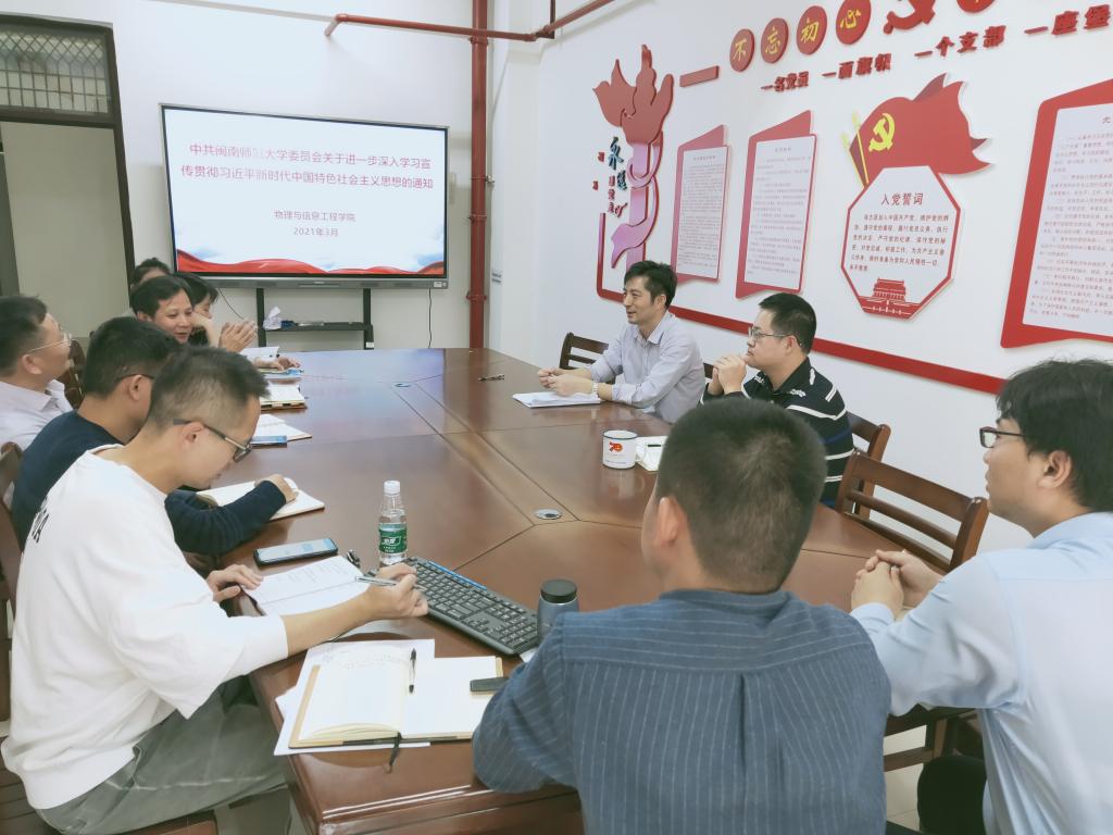 3月18日,物信学院党委在科技楼南915召开党史学习教育动员大会,深入学习贯彻习近平总书记在党史学习教育动员大会上的重要讲话精神,贯彻落实校党委党史学习教育动员大会上的决策部署。学院党委委员、各党支部书记出席会议。