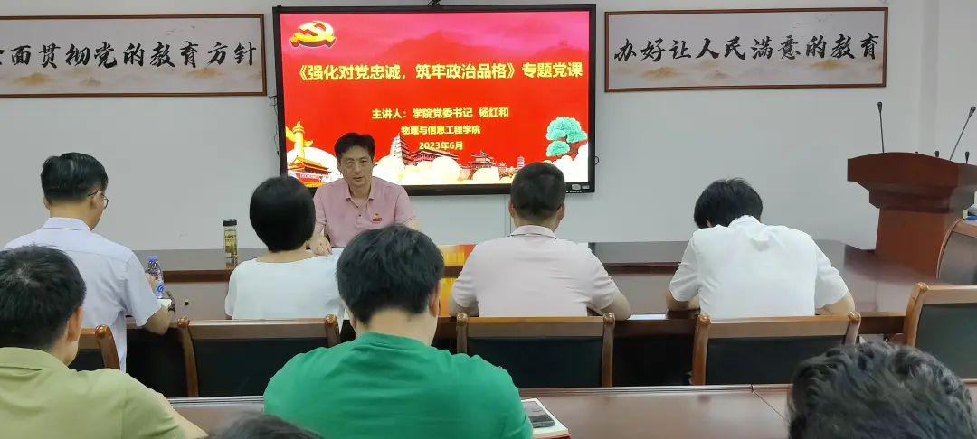 党委书记杨红和在科技楼北907会议室讲授题为“强化对党忠诚,筑牢政治品格”专题党课。学院党政领导班子成员、党委委员、党支部书记、党员代表等参加。