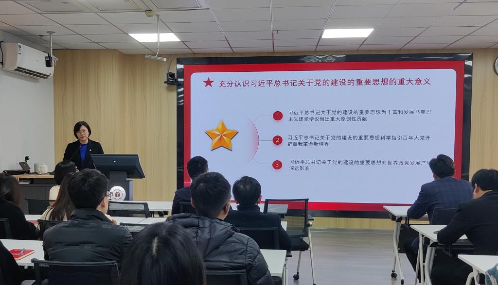 校党委组织部主持工作副部长陈慧燕老师以“深入学习贯彻习近平总书记关于党的建设的重要思想”为题,从“充分认识习近平总书记关于党的建设的重要思想的重大意义、深刻理解习近平总书记关于党的建设的重要思想的形成过程、全面把握习近平总书记关于党的建设的重要思想的科学体系和丰富内涵”等方面深入浅出地阐明了学习贯彻习近平总书记关于党的建设的重要性。她重点解读了“十三个坚持”的深刻内涵,为党员们全面学习、把握习近平总书记关于党的建设的重要思想的科学体系和丰富内涵指明了方向。