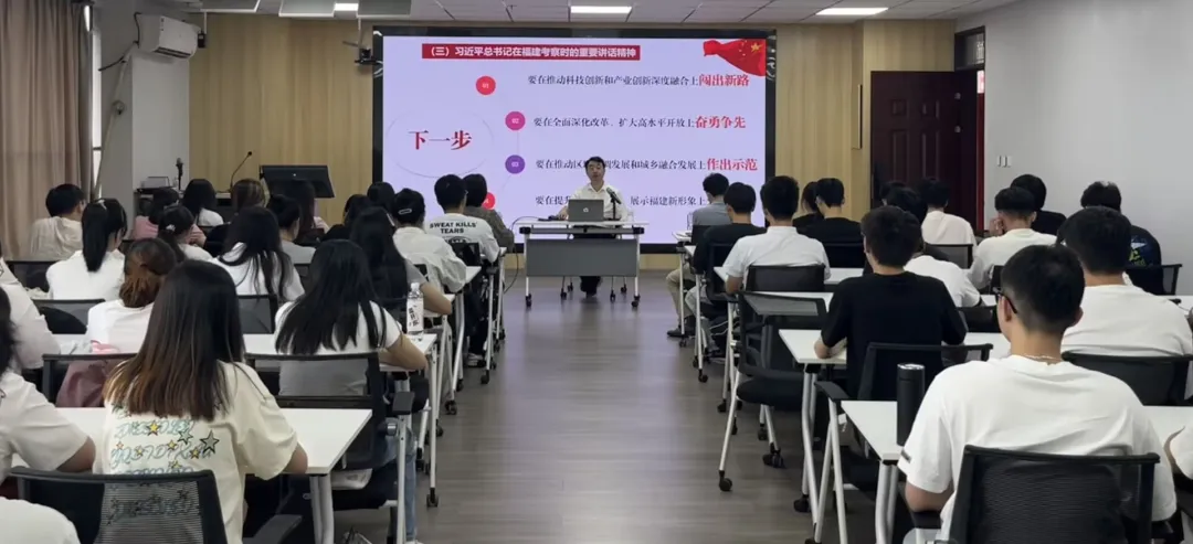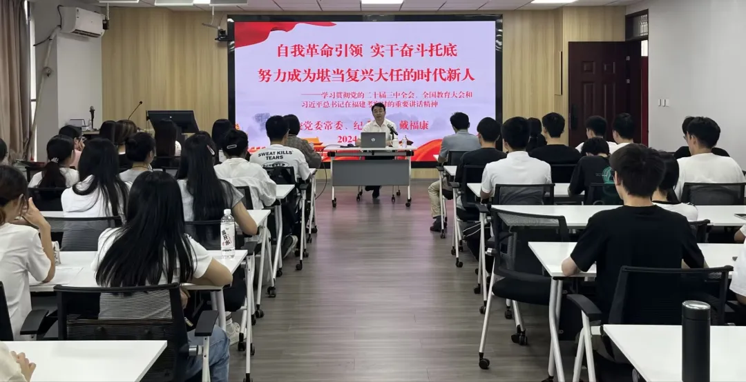 戴福康以“自我革命引领 实干奋斗托底 努力成为堪当复兴大任的时代新人”为题,从“深入学习党的二十届三中全会、全国教育大会和习近平总书记在福建考察时的重要讲话精神;聚焦管党治党,以永远在路上的清醒和坚定推进党的自我革命;坚持实干奋斗,争做堪当复兴大任的时代新人”等三个方面深入阐述大学生党员要加强政治理论学习、强化自我管理、坚持实干奋斗,努力成为有理想、敢担当、能吃苦、肯奋斗的新时代好青年。
