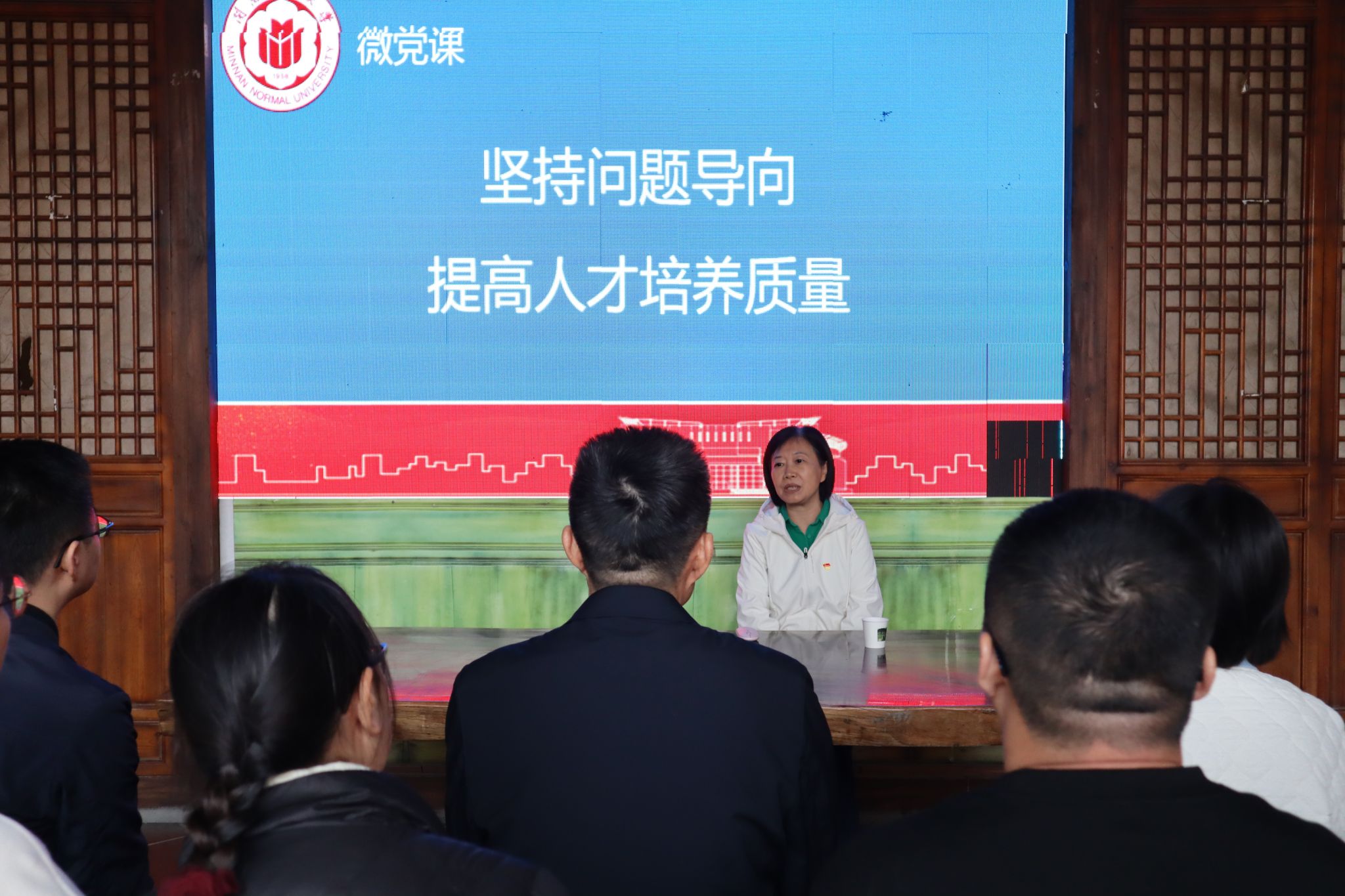 参观结束后,张宏怡副校长在村部小礼堂为教工党员讲授《坚持问题导向,提高人才培养质量》专题党课。党课紧扣深入学习贯彻党的二十届四中全会精神,聚焦“教育、科技、人才”一体化发展的战略要求与本科教育质量提升,系统分析了“十五五”时期高等教育面临的新形势与新要求。她强调,要坚持问题导向,将落实立德树人根本任务贯穿办学治校全过程。一是要坚守为党育人、为国育才的办学方向,持续优化人才培养体系,深化科教融合、产教协同,在专业、课程、实践等环节精耕细作;二是要着力建强高素质专业化教师队伍,弘扬教育家精神,引导教师潜心育人、争做立德树人的“大先生”;三是要一切工作聚焦学生全面发展,持续深化教育教学与评价改革,营造潜心向学、勇于创新的育人生态;四是要坚定理想信念,将教书育人的责任转化为攻坚克难的实际行动,在直面和破解真问题中持续提高人才培养质量,积极服务科技自立自强,努力培养担当民族复兴大任的时代新人。