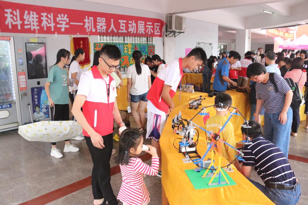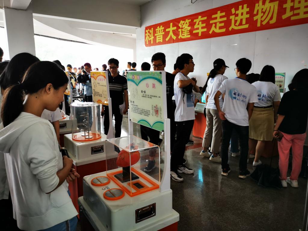 此次物理大观园设有八个模块:一是电子设计作品展区,包括校电子设计大赛、省合泰杯竞赛一等奖作品等;二是物理教具展区,出自未来人民教师们的作品新颖有趣,各种各样的新型教具引得大家观看讨论;三是智能小车和无人机展区,地上小车智能循迹穿梭,空中无人机翩然来回;四是画伞展区,色彩斑斓、风格多样的画伞,是物信人温柔的一面;五是板块展区,文图结合,精心设计的展板详细介绍了大观园活动内容、还有禁毒知识、反邪教海报,时时向大家科普宣传;六是科普大篷车展区,简单有趣的游戏机是游园必体验项目;七是科维游戏互动区,利用乐高EV3拼装机器人,开启游戏大闯关;八是义务维修区,彰显了mx动漫